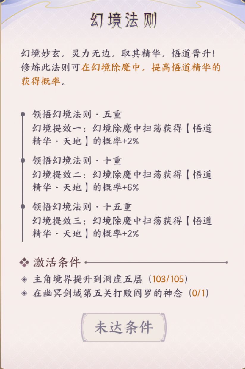 开启条件考虑大部分玩家水平,设计的非常低只需要境界达到洞虚5即可开启。