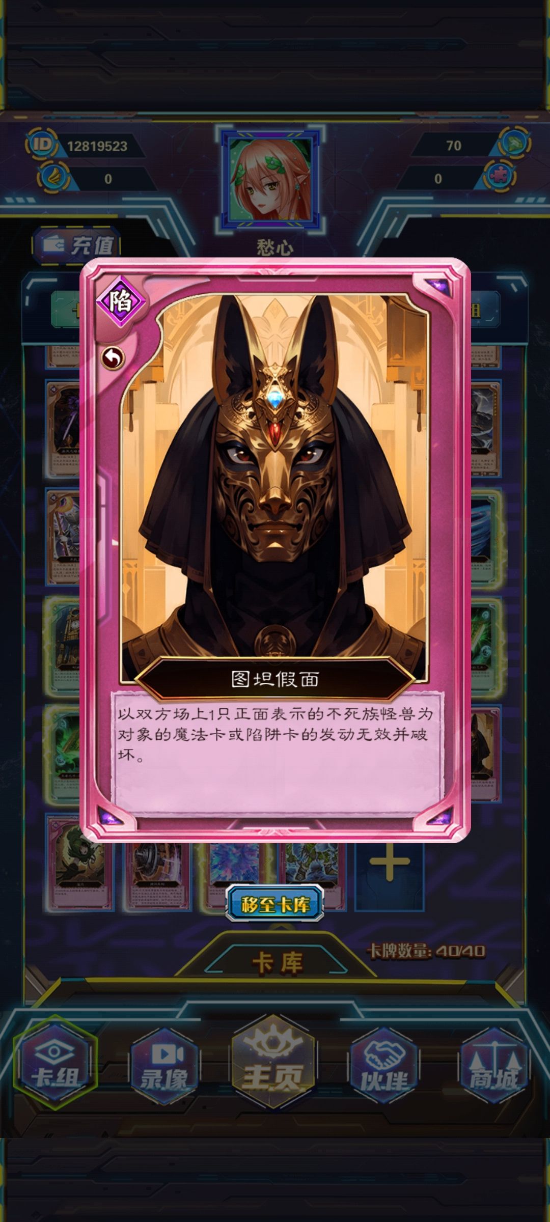 防守牌 落穴,炸裂装甲,图坦假面(核心反击陷阱卡,盗贼的七道具,沙尘之大龙卷,魔法抽取,魔法干扰阵,雷破,