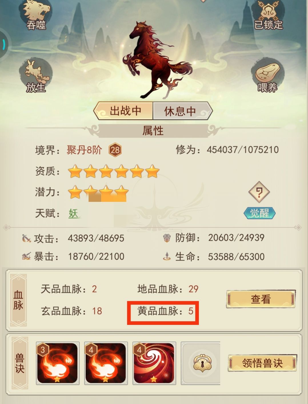 在宠物血脉栏可以明显看到感悟到的黄品血脉比地,玄精血少很多。