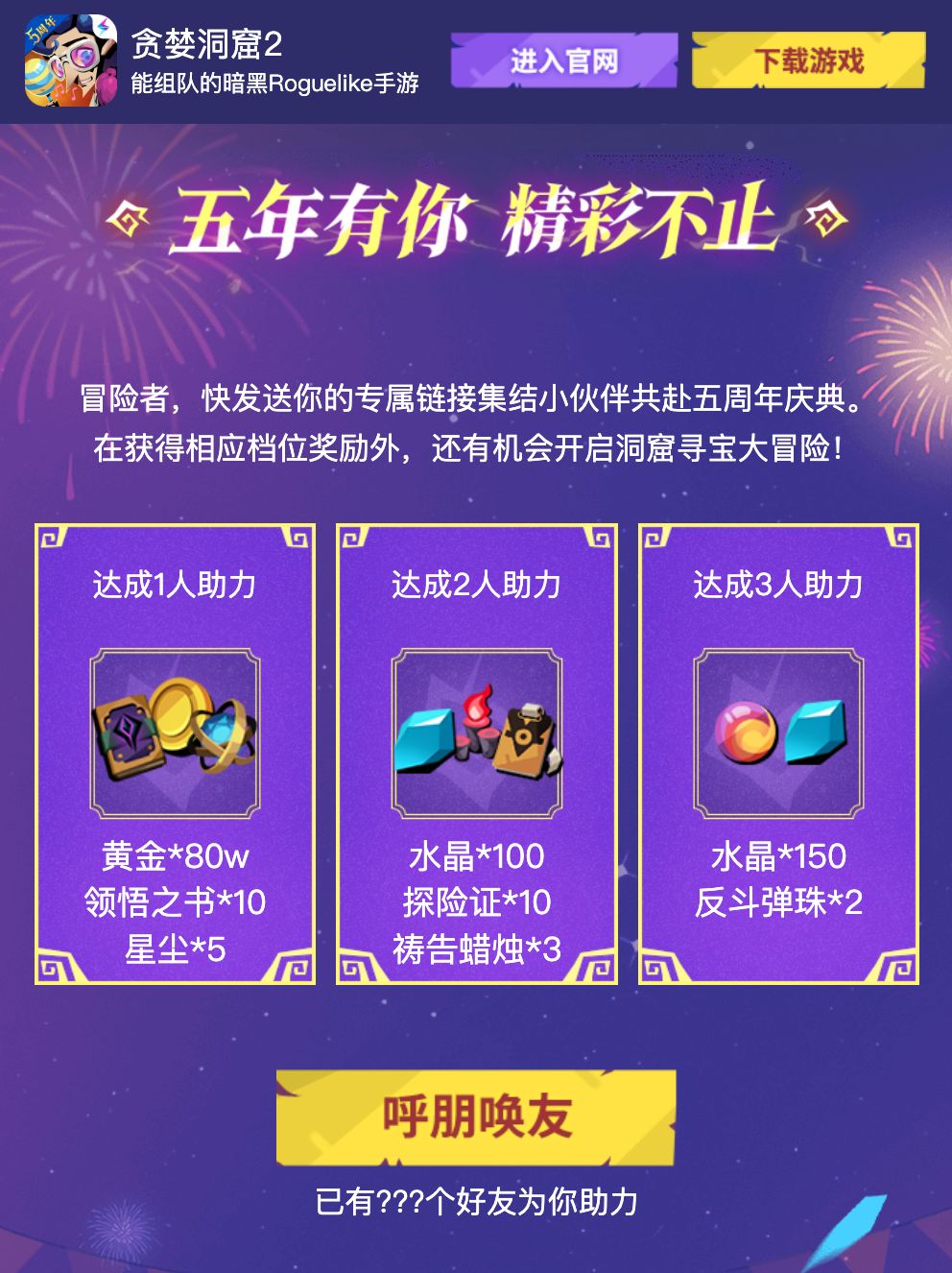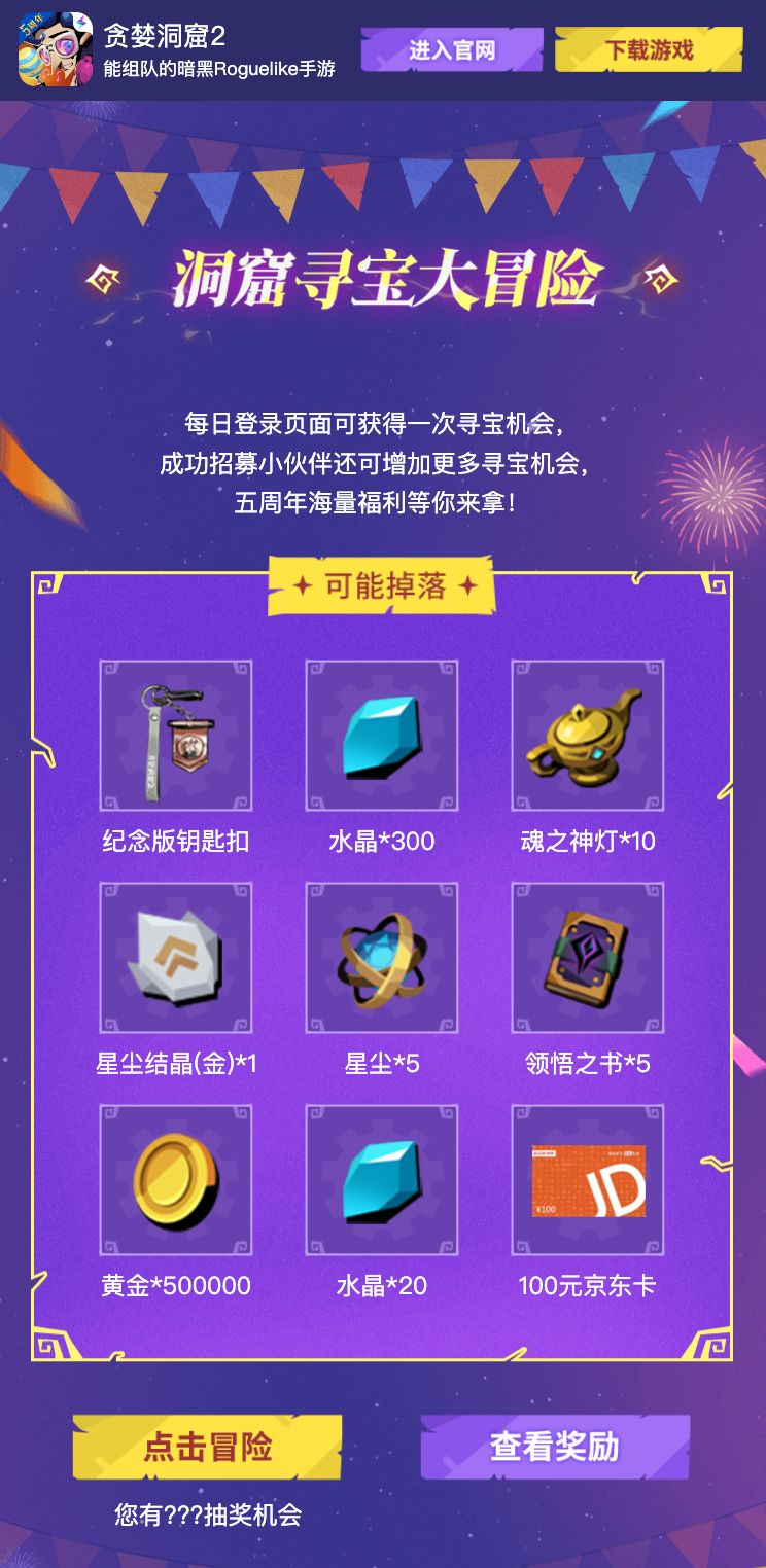 《贪婪洞窟2》五周年庆版本已经正式更新啦,欢迎大家登录游戏体验!当然~周年吉时补给也应时到来,冒险者们点击H5组队即可加入,领取金币、水晶、探险证等丰富的游戏道具资源,快来集结小伙伴一起来参与吧~!