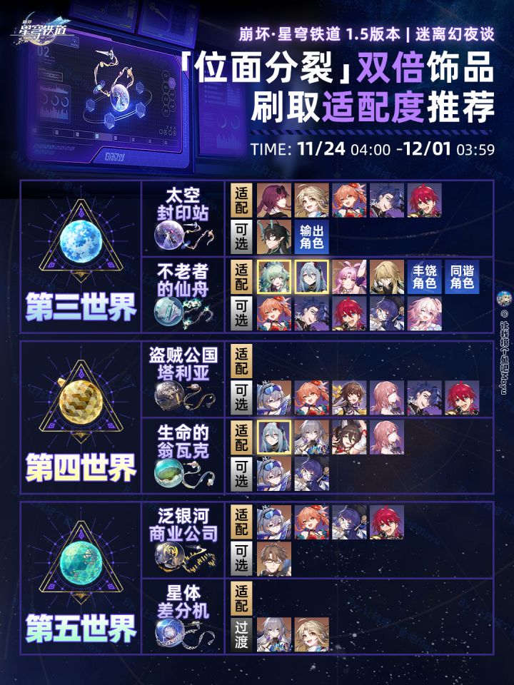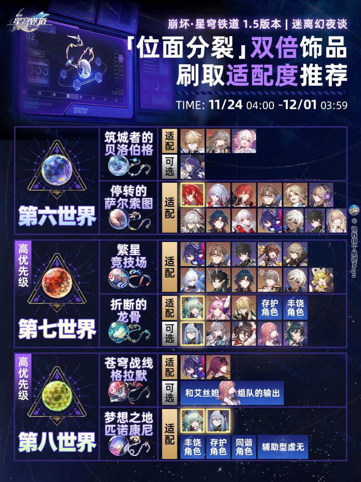 1.5版本划重点!!!【藿藿】上半卡池已经上线;常规辅助套装【不老者的仙舟】【折断的龙骨】都可使用;新饰品【梦想之地匹诺康尼】可对风C增伤,由于攻击词条对刃效果不明显,推荐在藿镜刃队时选用。