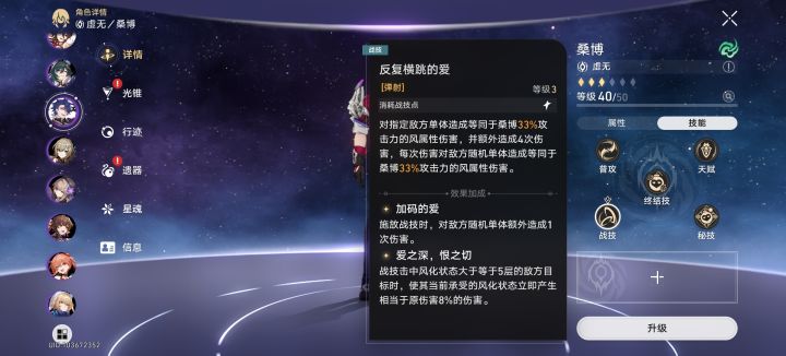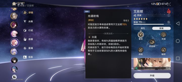 如此,在选择上,艾丝妲仅仅80%的普攻灼烧命中概率就有些不够看了,dot伤害也很低,排除!虽然终结技加速和天赋加攻击也不错,但队伍里仅仅让卡芙卡与银狼&佩拉吃拐有些发挥不出1+1>2的同谐能力。