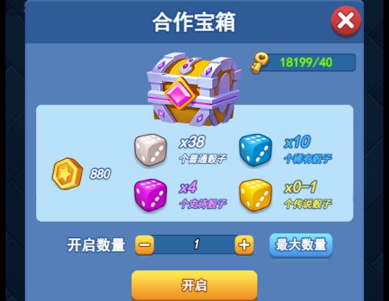 (等级31级)合作宝箱可以开出金币*1380,普通骰子*63,稀有骰子*16,史诗骰子*7,传说骰子*0-1等(等级22级)合作宝箱可以开出金币*1160,普通骰子*52,稀有骰子*13,史诗骰子*6,传说骰子*0-1等可以看出等级越高,合作宝箱开出的奖励就越多,传说骰子概率相同。