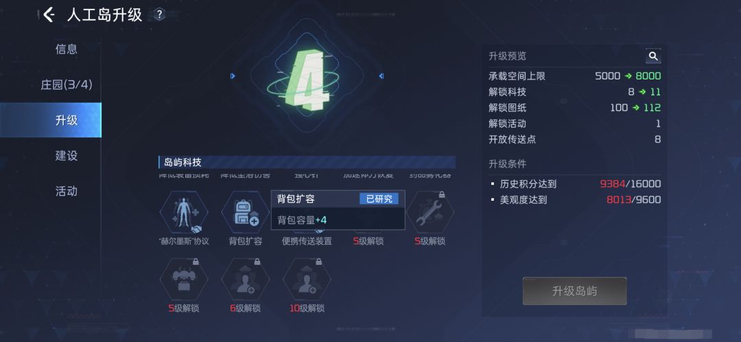 3.加入人工岛,4级岛屿科技可以提升背包容量,5级岛屿科技可以召唤无人机将少量背包物品邮寄回庄园。