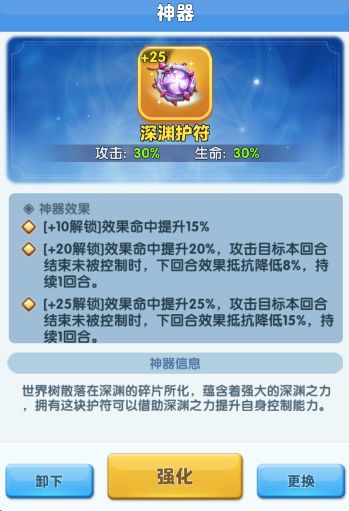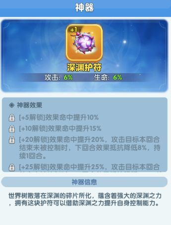 攻击目标在本回合内未被控制时,使得目标效果抵抗降低,同时提升佩戴英雄的效果命中属性。深渊护符是一件适合控制型英雄佩戴的神器,能够极大地提升英雄控制技能命中敌人的概率!
