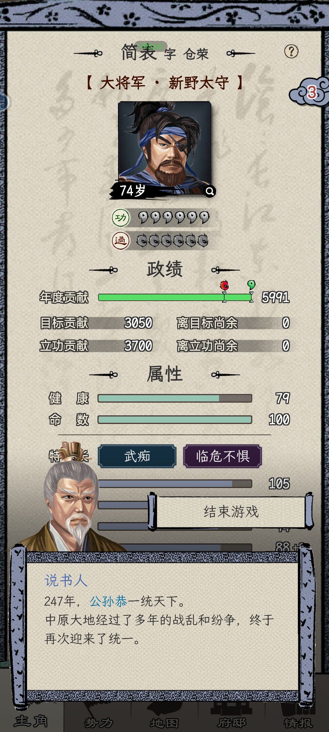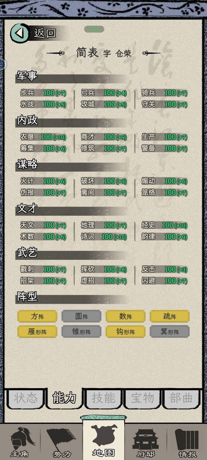 2、内政能力:初始建筑高些,方便提高将军级别任务的成功率;后期(自己做了太守)笼络先提高,方便一直做内政用就行了。