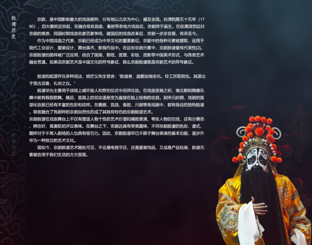 屏幕变暗,文字浮现。细读之下,我发现是对脸谱历史的介绍,并从中得知,古人曾用脸谱在战场上威吓敌人,还有祭祀中巫师化妆。戏曲始于隋唐,或许还能追溯至南北朝时期。起先,戏子们戴着假面进行歌舞表演,时代变迁,逐渐演变为直接在脸上绘制妆容。