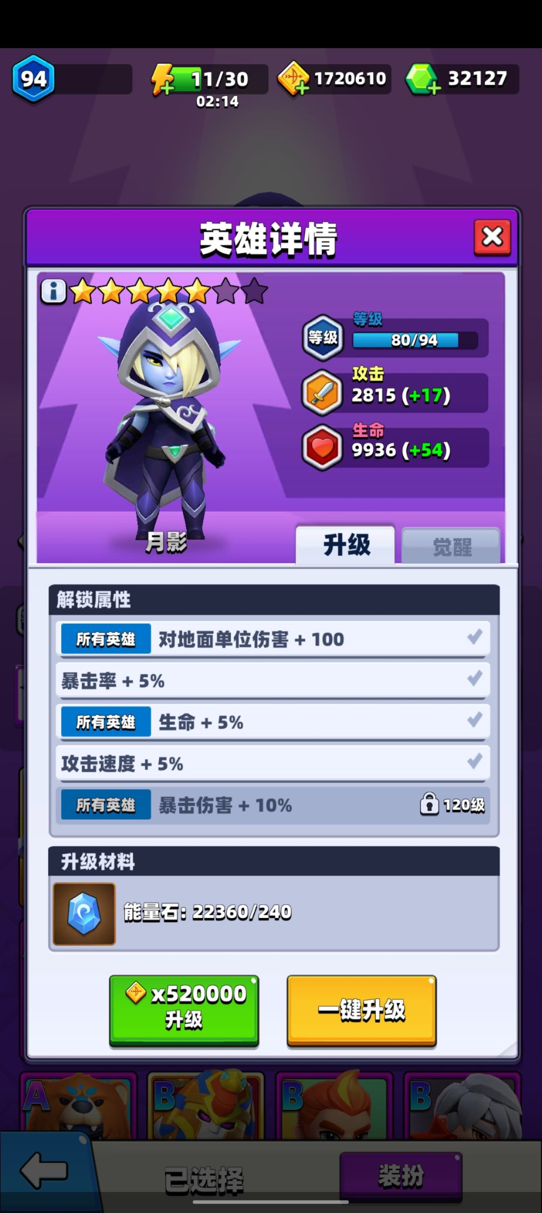月影属于物法双修的综合性英雄,80级四星后攻速和血量低的短板被弥补,六星后人物自身7%暴击率加龙卷白嫖皮肤7%暴击率保证了暴击爆发输出,当前游戏暴击伤害是绝对王道。
