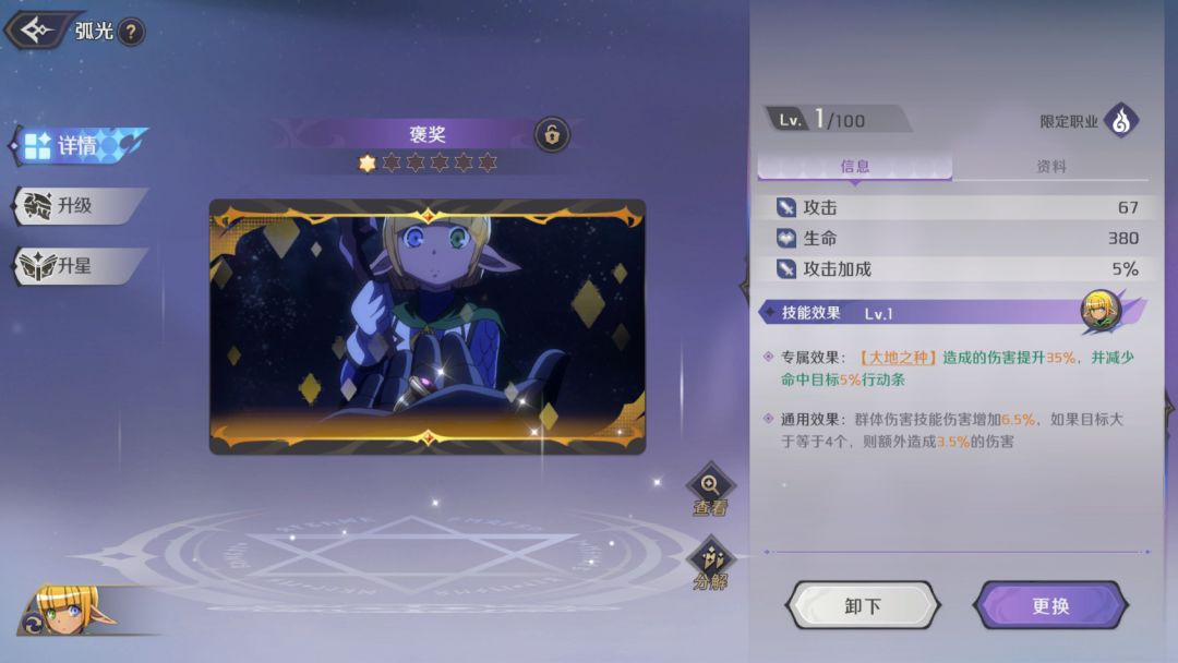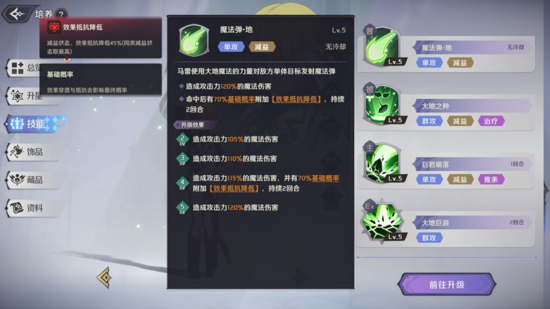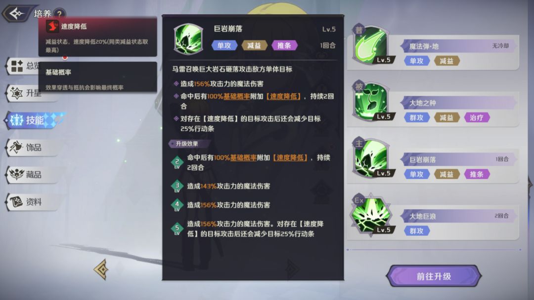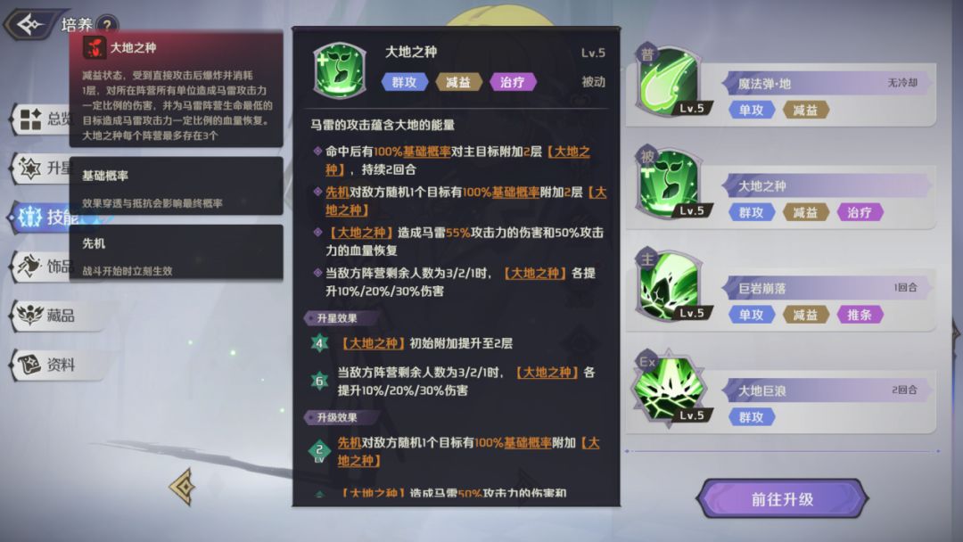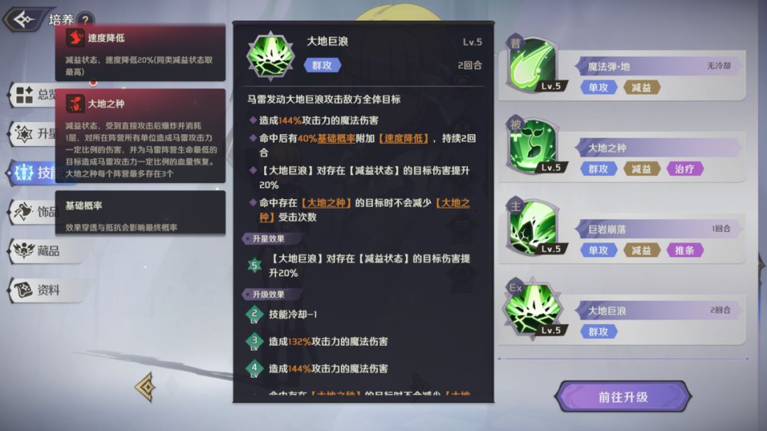 群体攻击技能,对敌方所有目标造成高额的魔法伤害,有概率附加【速度降低】状态,技能5级时,命中存在【大地之种】的目标时不会减少【大地之种】层数,角色5星时,对拥有减益效果的目标造成额外伤害。
