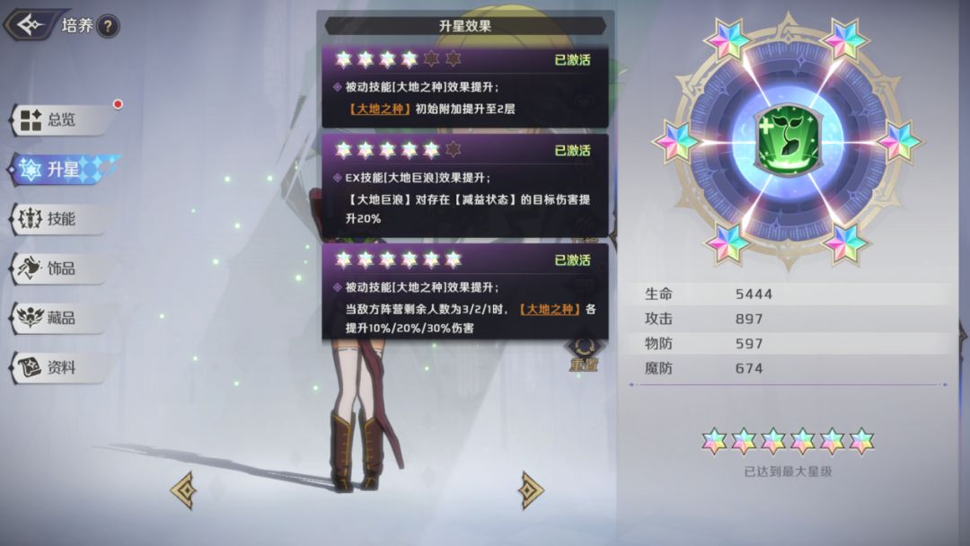 马雷的关键星级为4星和6星,4星时【大地之种】的初始附加提升至2层,这就极大程度的保证了马雷的持续输出能力,可以在一定程度上避免被净化类技能完克,可以说是产生了质变。因此,若以马雷为核心主C,至少要将角色提升至4星。
