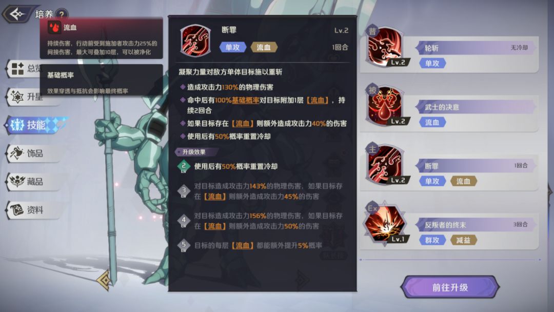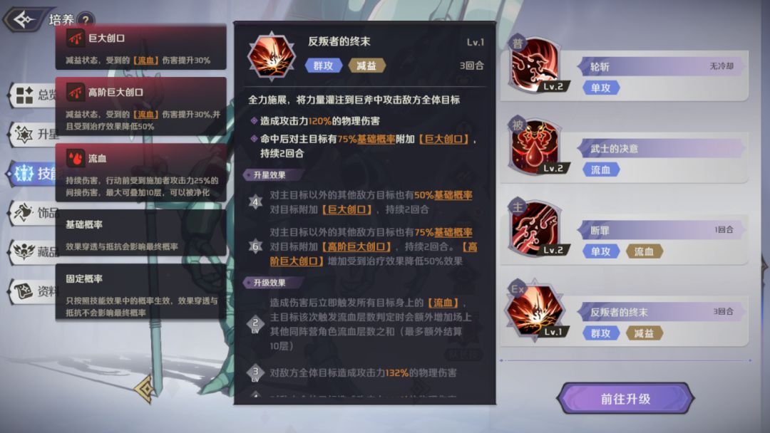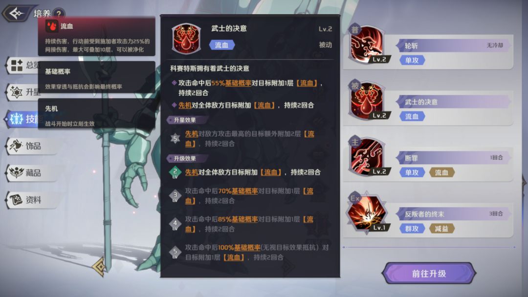 被动技能是科赛特斯的重要输出技能,在攻击命中后有概率造成【流血】状态,技能满级时概率变成100%且无视目标效果抵抗,配合其他技能可以利用【流血】状态打出高额的伤害。