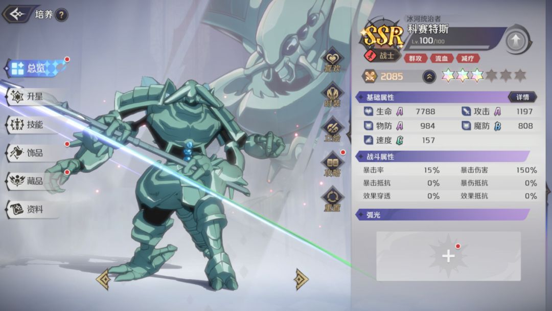 科赛特斯,是《纳萨力克之王》中,综合输出能力十分优秀的战士角色,其拥有仅次于莫莫、赛巴斯的单体输出能力,同时也拥有超过莫莫和赛巴斯的群体输出能力,在队伍中,即可以作为主C,也可以作为副C来补充伤害,尤其是大招所附带的减治疗效果,可以有效克制回复能力很强的队伍,是竞技场中十分常见的强力角色。今天就给大家带来科赛特斯的角色评测。