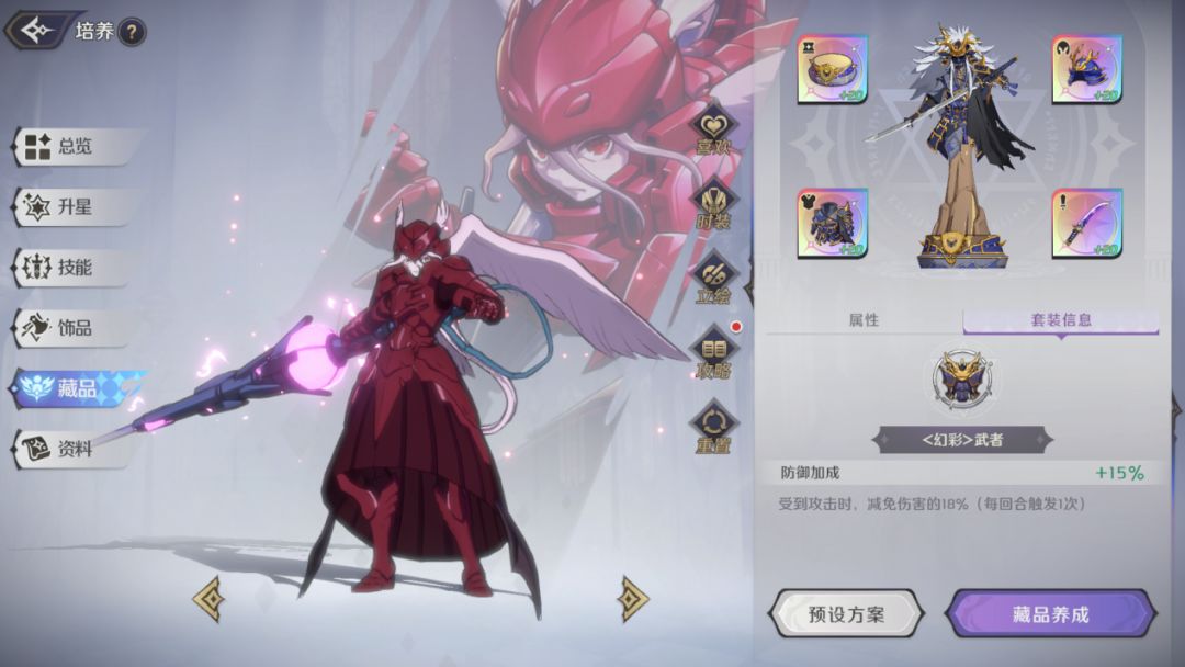 这里重点推荐【武者】套装。其提供的防御加成和伤害减免都完美的适配骑士夏提雅的技能机制和战斗风格。