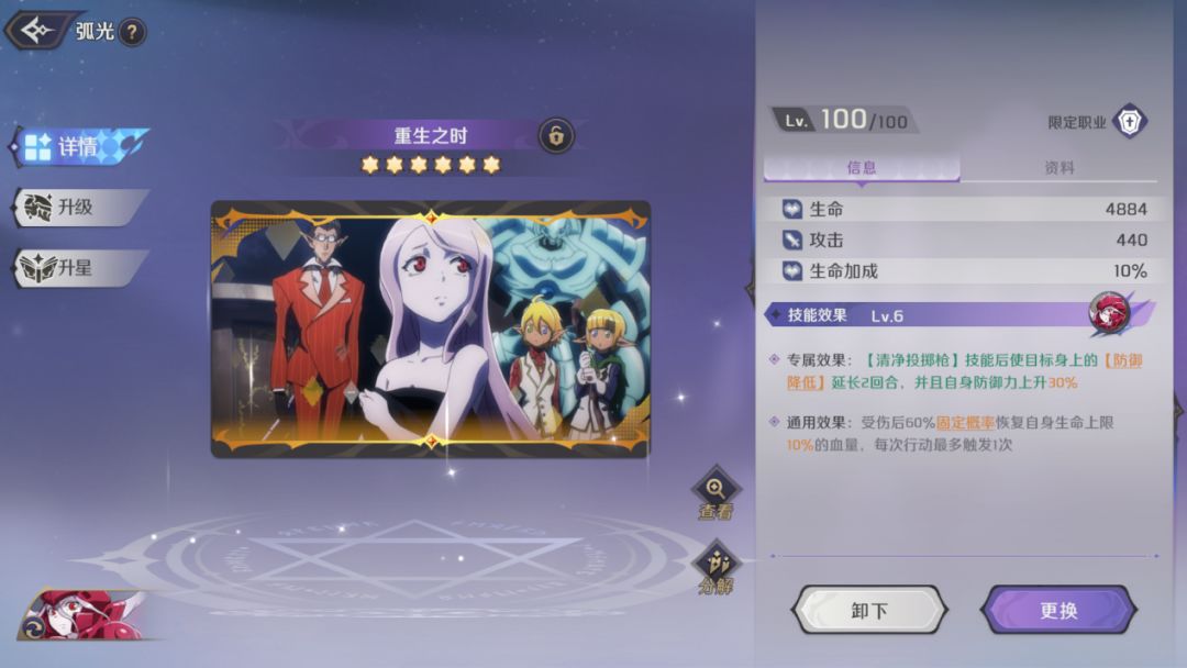 单体伤害技能,无冷却,伤害附加生命百分比伤害,技能4级时,命中后有100%基础概率使目标获得【吸血鬼之手】,持续2回合。队友攻击具有【吸血鬼之手】状态的敌人,可以回复攻击者6%的生命。