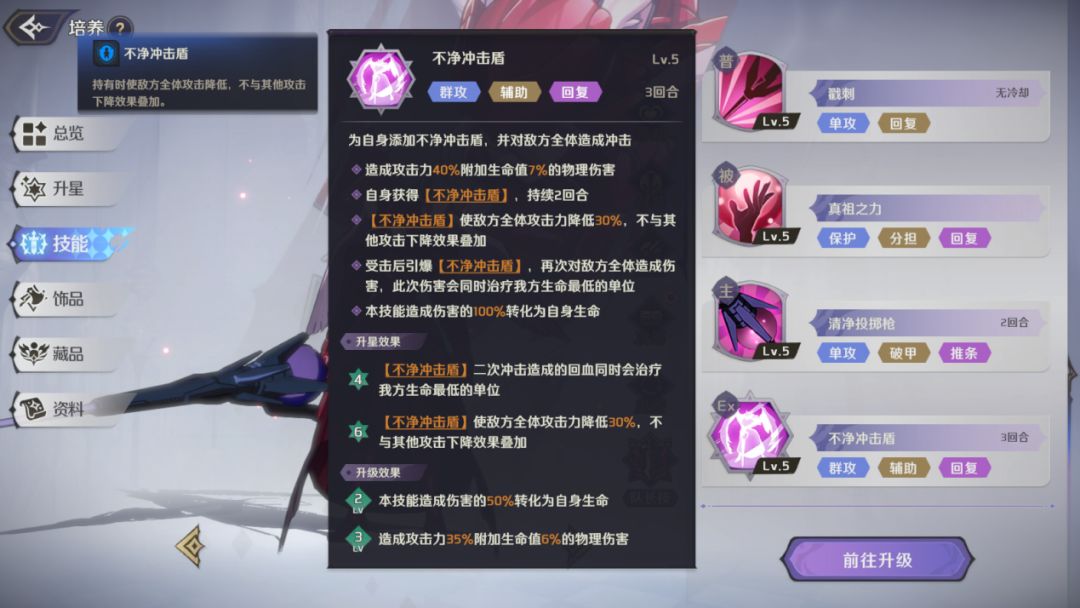 防御型技能,冷却3回合,为自身添加不净冲击盾,同时对敌方全体进行攻击。自身拥有不净冲击盾时,受攻击后引爆【不净冲击盾】,再次对敌方全体进行冲击。技能2级时,本次伤害的50%将转化为自身生命值,技能5级时,转化比例为100%,4星时,还会对我方生命值最低的单位造成治疗,6星时,使敌方全体攻击力下降30%。