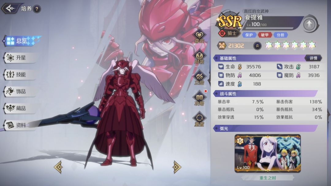 女武神夏提雅,SSR骑士,拥有S级生命成长和双A级防御成长,可以帮助队友分担伤害,自身拥有高额的防御加成,还可以通过时光回朔回复自己的状态,免疫致命攻击,是一个可以令人信赖的坦克英雄,无论推图副本还是竞技场作战,都是至尊们可以依赖的伙伴。