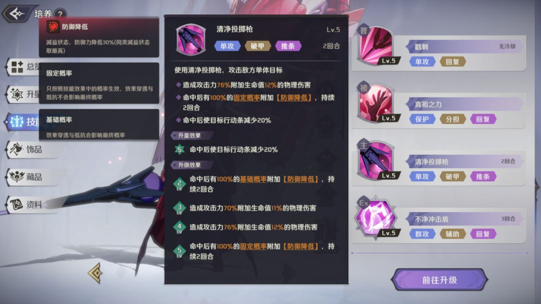 单体伤害技能,冷却2回合,女武神夏提雅投掷长枪攻击目标,造成伤害的同时有概率破甲,技能等级2级时,破甲概率为100%基础概率,技能等级5级时,变为100%固定概率。5星时,命中后使主目标行动条减少20%。