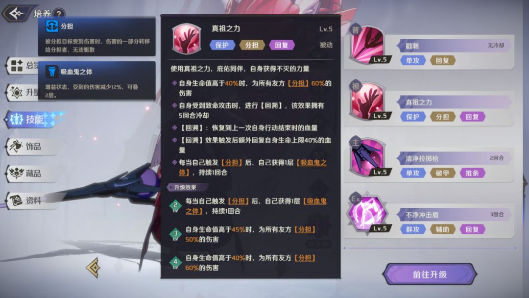 群体防御类技能,当夏提雅自身生命值高于40%时,为所有友方角色提供【分担】效果,将其所受伤害的至多60%转移至自身。自身受到致命伤害时,会进行【回溯】,回复到上一次行动结束时的血量。技能2级时,触发分担以后获得攻击吸血能力,技能5级时,回溯后额外回复40%生命上限的血量。