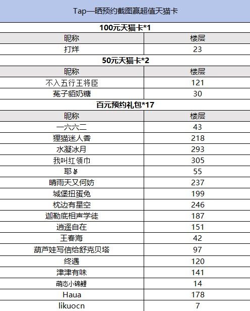 【活动奖励】:100元天猫卡*1 50元天猫卡*2 百元预约礼包*17