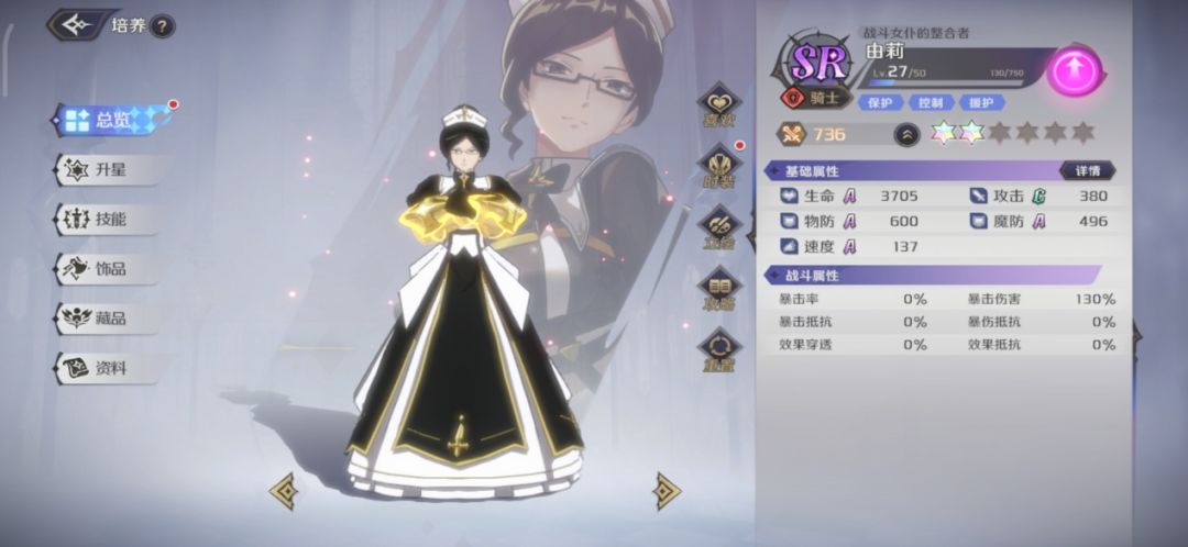 第三梯队选用由莉,由莉通过援护来分担队友受到的伤害,同时还有一定的控制能力,特别是使用女仆队时,还具备出色协战能力,因为有邀战效果,而且只针对女仆团成员。