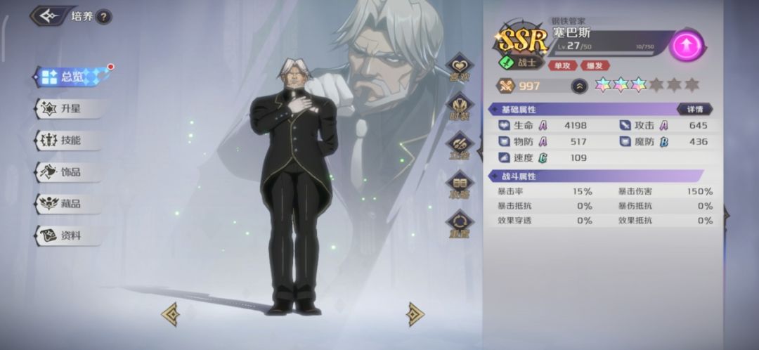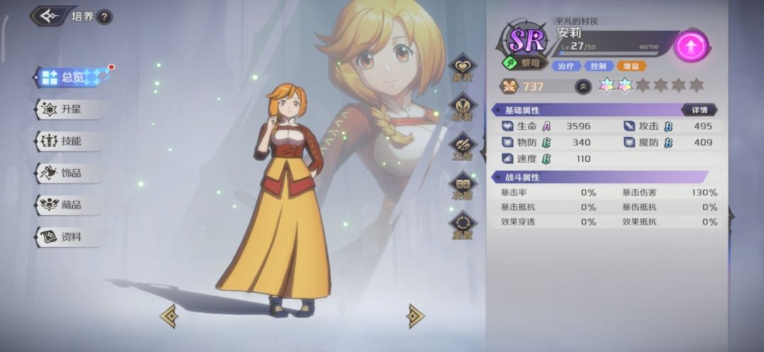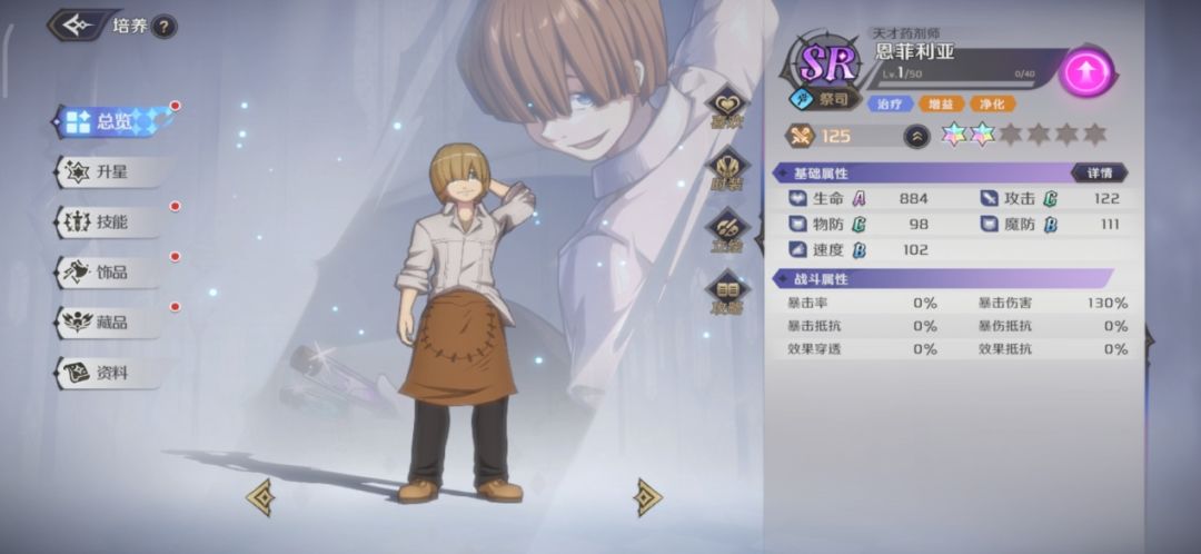 第二梯队使用恩菲利亚。玩家如果运气好,前期还有一定概率抽到恩菲利亚,他的被动自带增益效果,可以上场自动给队友释放随机增益,主动技能则是群疗,EX技能是单体拉条与治疗效果强化,前期无论是刷异界征途还是打副本都非常给力。