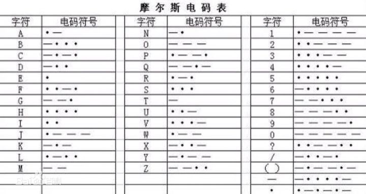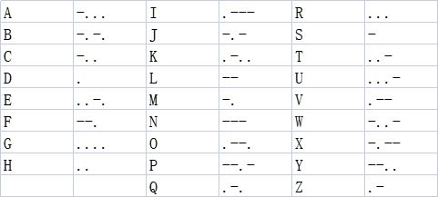 摩尔斯电码(Morse code)也被称作摩斯密码,是一种时通时断的信号代码,通过不同的排列顺序来表达不同的英文字母、数字和标点符号。它发明于1837年,是一种早期的数字化通信形式。不同于现代化的数字通讯,摩尔斯电码只使用零和一两种状态的二进制代码,它的代码包括五种:短促的点信号“・”,保持一定时间的长信号“—”,表示点和划之间的停顿、每个词之间中等的停顿,以及句子之间长的停顿