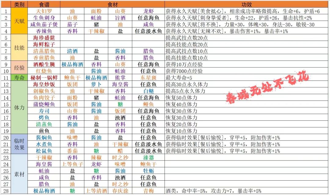 1.天赋类中天妇罗、生鱼刺身百搭,香辣鱼适合暴击流输出人物,咸鱼茄子煲减敏锐(命中/招架相关),酌情食用;