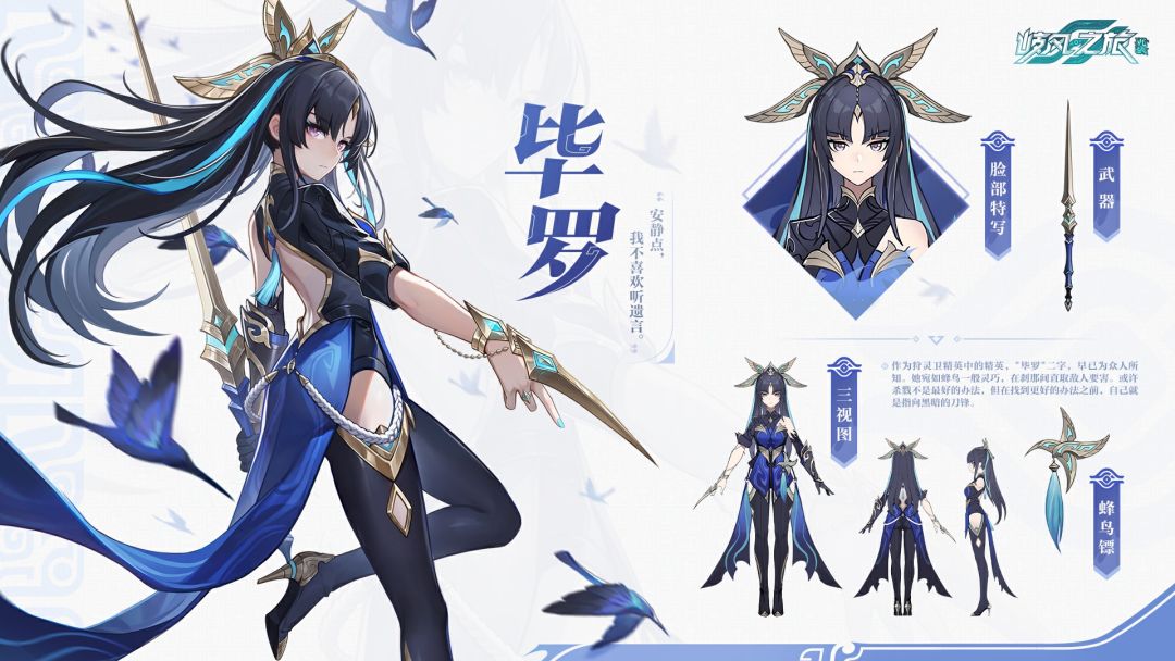 不过最显眼的还是她身上的以“快”而闻名的蜂鸟元素咕~先行者可以仔细看看毕罗头上的头饰,是不是很像一只振翅欲飞的蜂鸟呢?在最为明显的头饰之外,我们还能注意到毕罗身上那些造型独特的金属装饰,大多呈现出尖锐且与翅膀相似的线条轮廓,果断、凌厉的暗卫形象便在此打造出来。