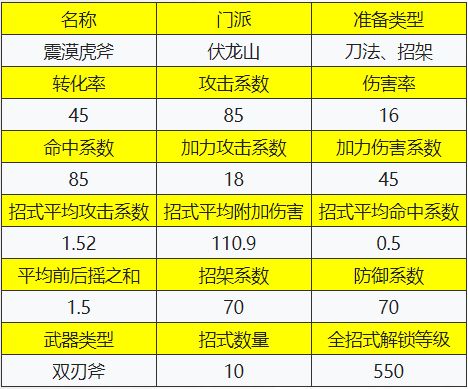 自身系数比较平庸,绑定双刃斧神兵,在使用加速双刃斧神兵时平砍略高于自己家的轩辕斧法,略低于带不减速长枪的虎破天罗枪,整体效果偏向于防御。