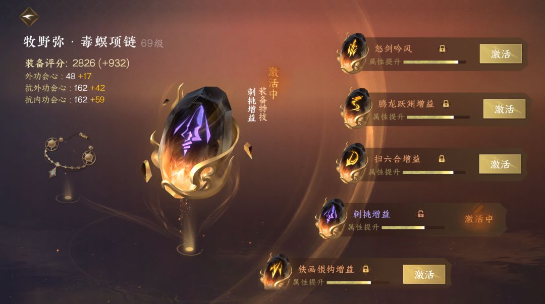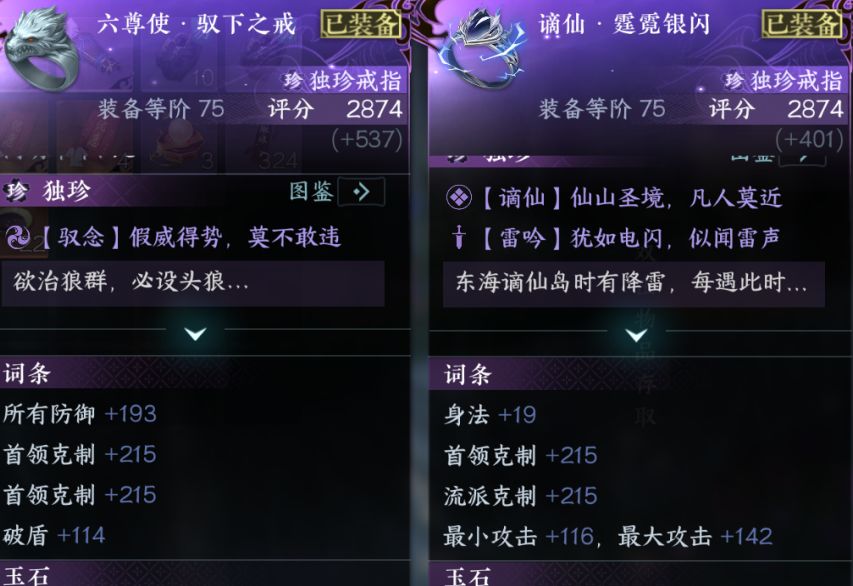 戒指搭配:六尊使+谪仙先这样带,比较稳定的首领克制加成以及攻击加成。