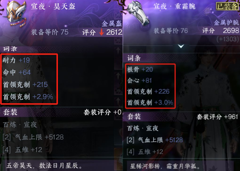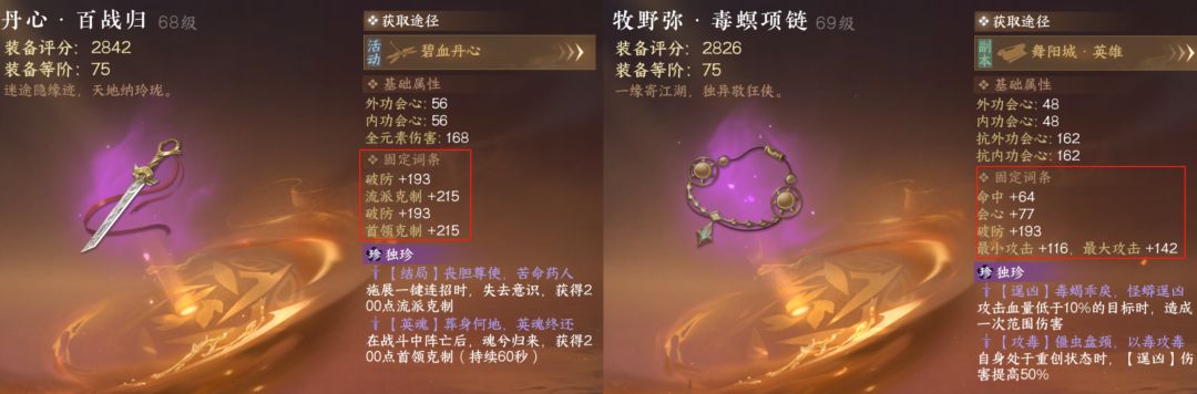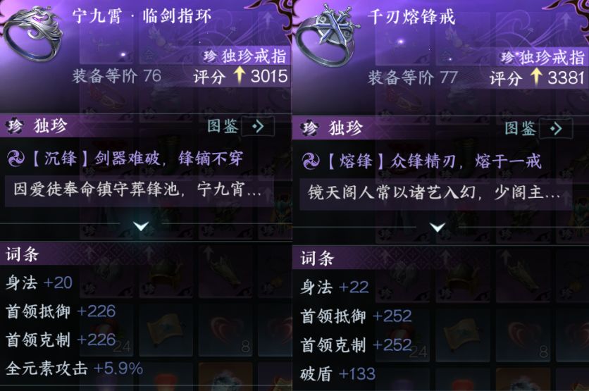 宁九霄需要和新的几件独珍饰品搭配,这个目前丹心还是很够用的,如果有【源轻纲·八咫剑】,可以搭配上测试一下伤害,本人太黑啥也没出这周。千刃戒指需要穿上之后,再分解紫装50件会加成100元素伤害,等分解25件左右的时候可以先换掉六尊使戒指试试伤害。