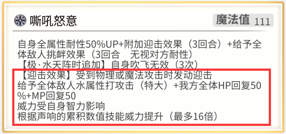 1.AC杜拿利斯的固有技能(XX怒意)会为自身附加受到常规物理/魔法伤害时进行反击的效果,反击攻击为智力依存的水属性打攻击,威力根据声响(珠子)提升,30个珠子达到最大25.6倍率。