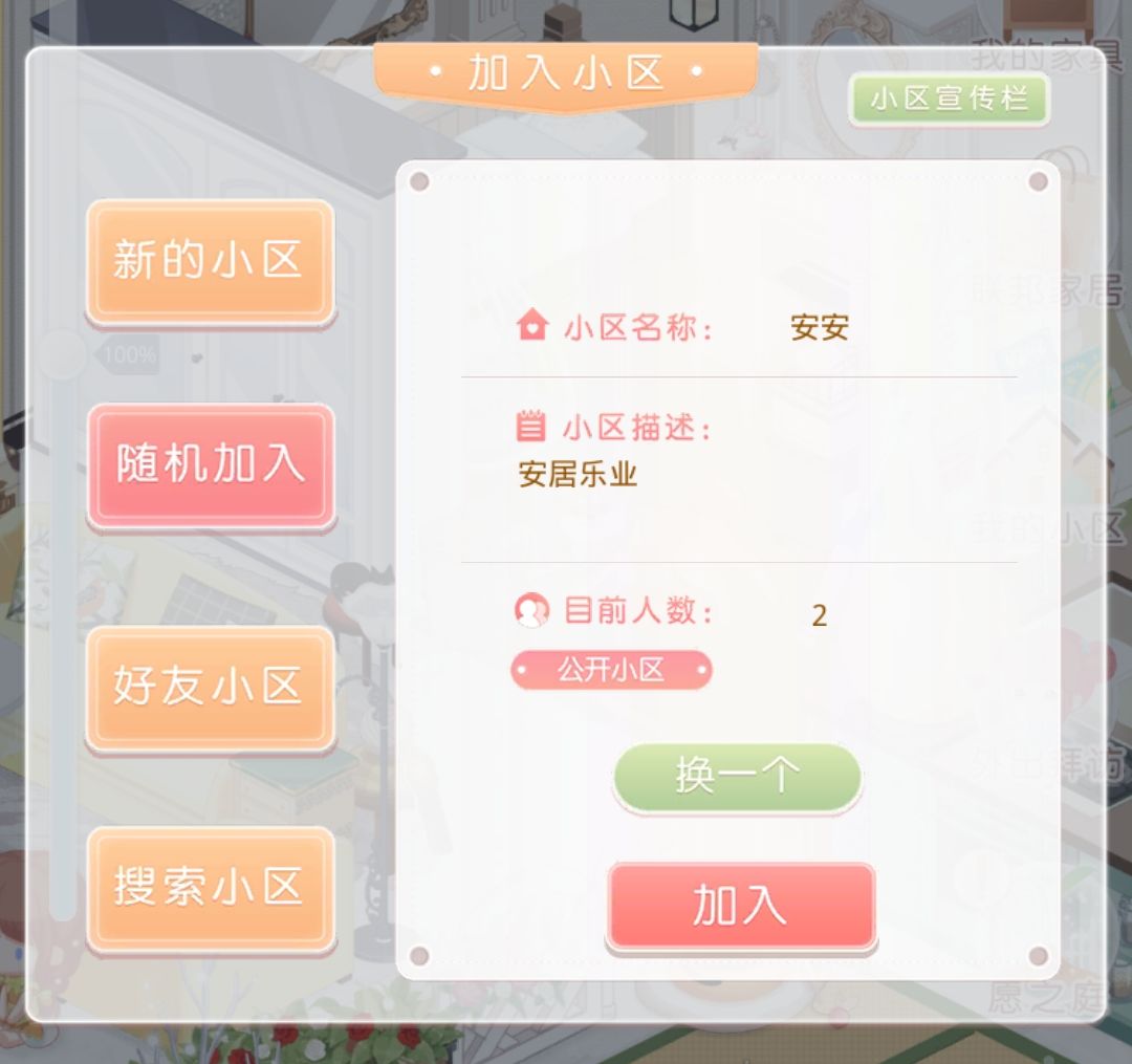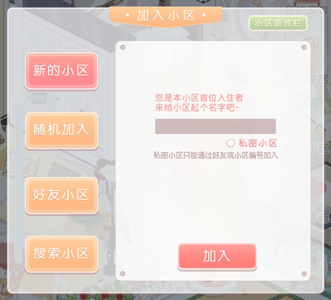 选择想要进去的小区,可以自己创建,加入别人创建好的,好友的,有小区编号可以搜索