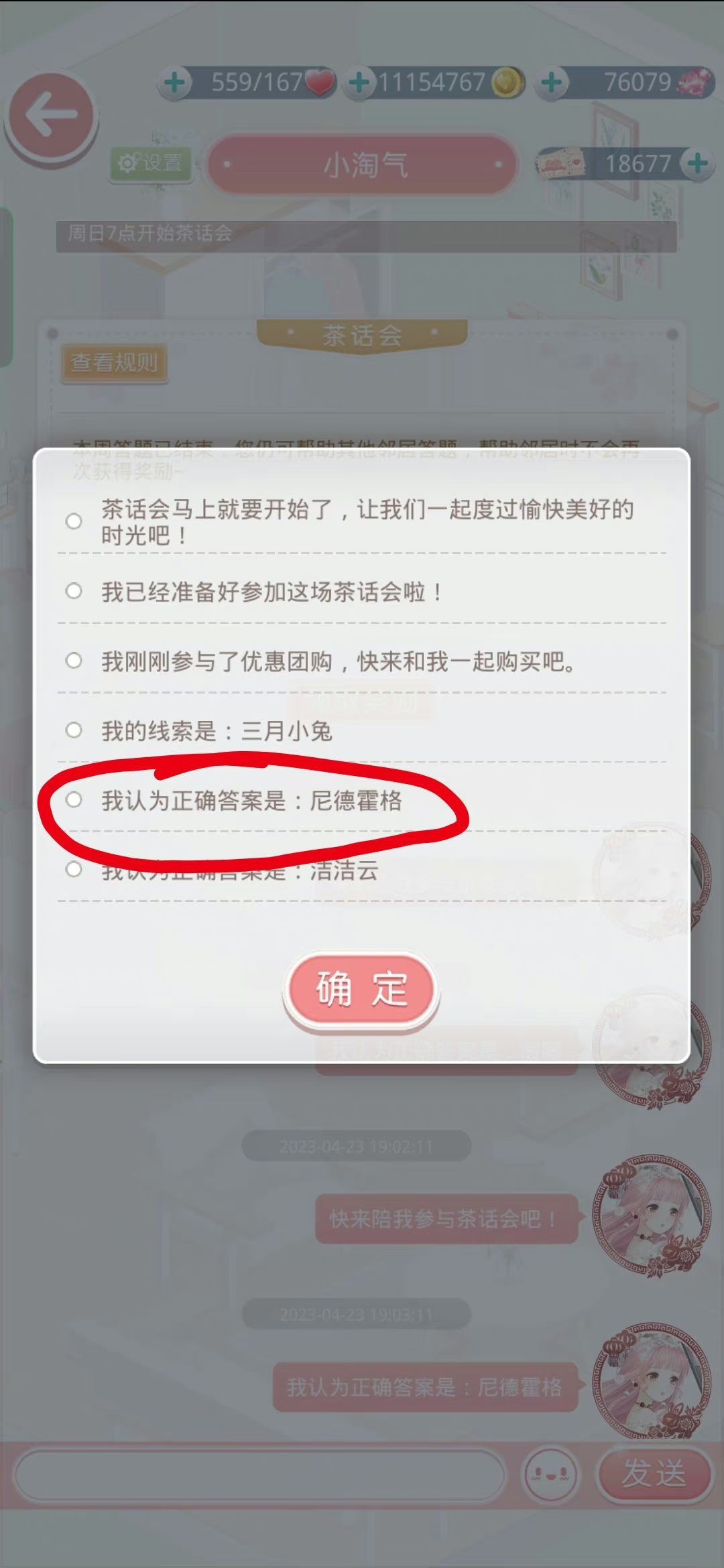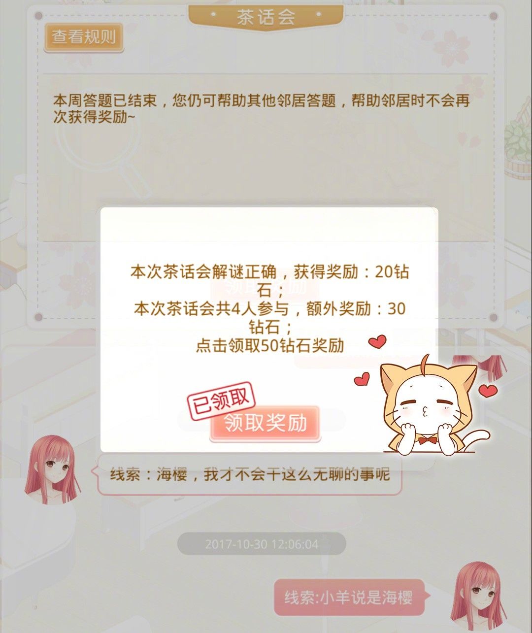 是在小屋小区的一个答题活动。活动形式为四选一选择题,在规定时间内完成答题会有30~50钻不等的钻石奖励。茶话会举行频率为一周一次