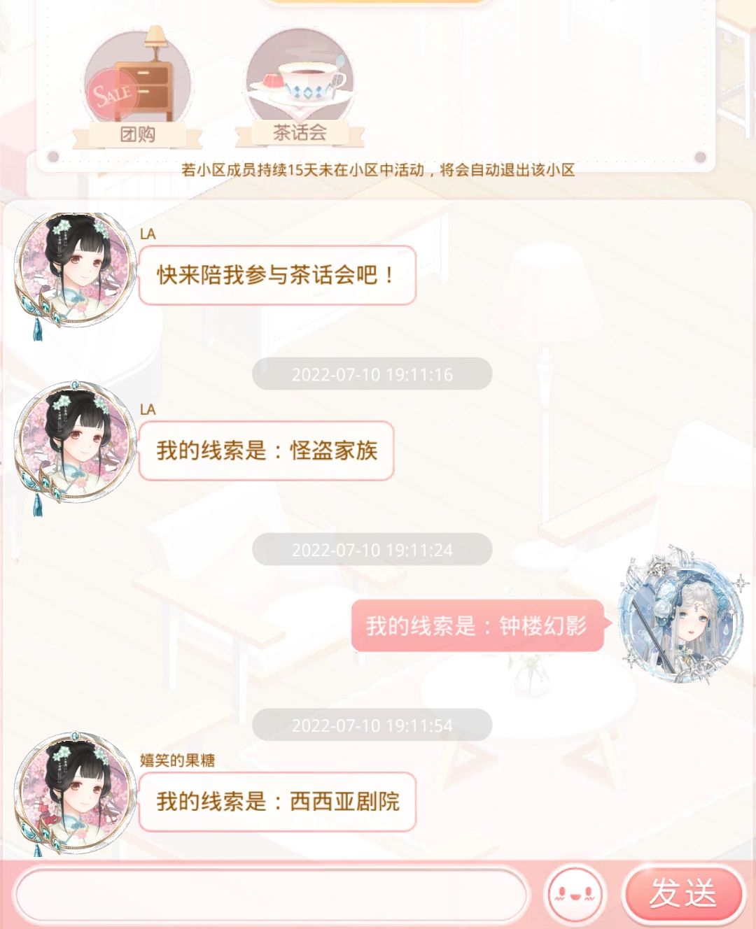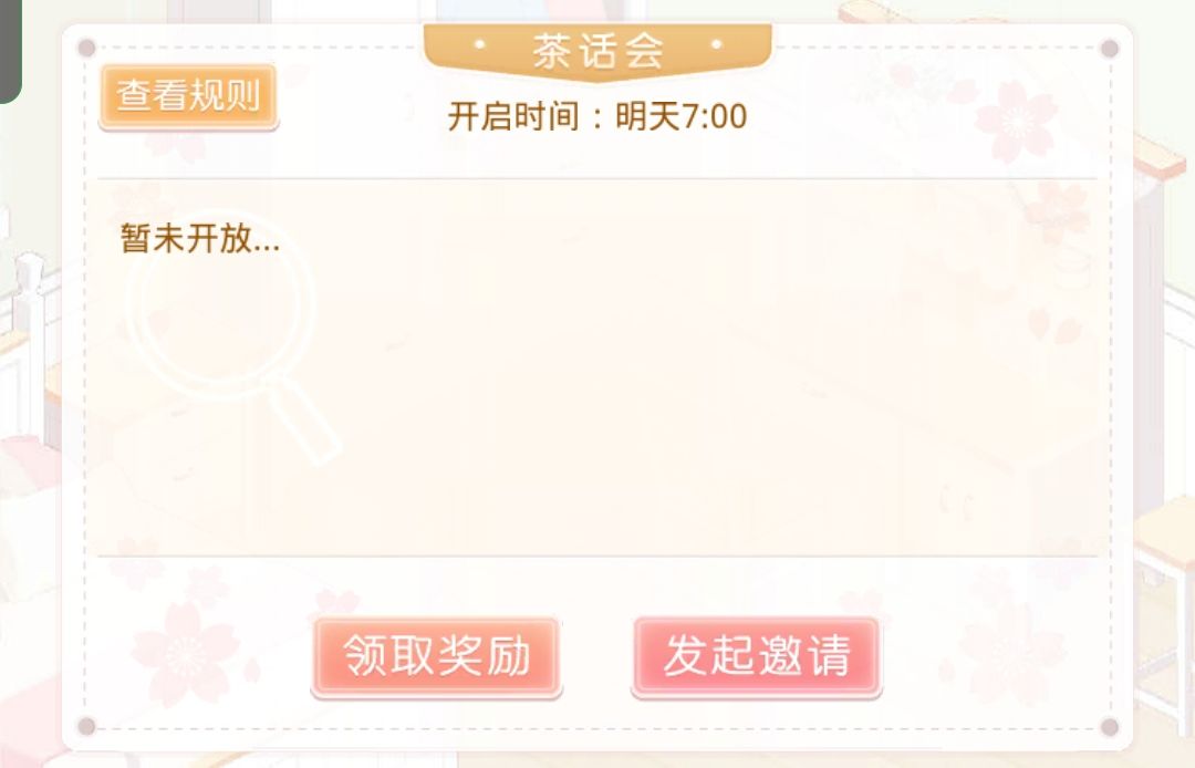 注意:邀请时效仅有一分钟 在一分钟之内没有除了邀请者之外的人参加,则邀请失败不能开启茶话会。