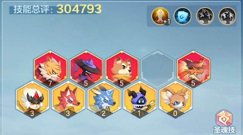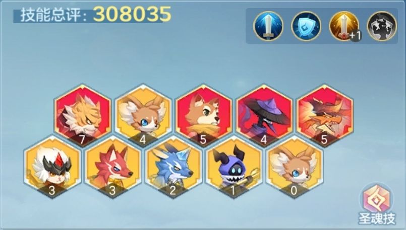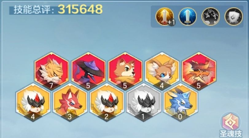 如图一所示,合成一个七级魂技格子全部打开以后,其他的格子就开始用0级魂技二合一往上合,合成到五级魂技就暂时不要继续往上合了,换一个魂技继续合到五级,当你合成到如图一的地步,十个格子魂技等级按照最高到最低等级排名就是7554433210这个等级,到了这个时候,如果再想往上合成魂技,那就只能把55或者44或者33往上合才能空出格子继续合成。这里我想说的是魂技合成的选择要优先以宗师魂技为准,那么到了图一的地步接下来应该是: