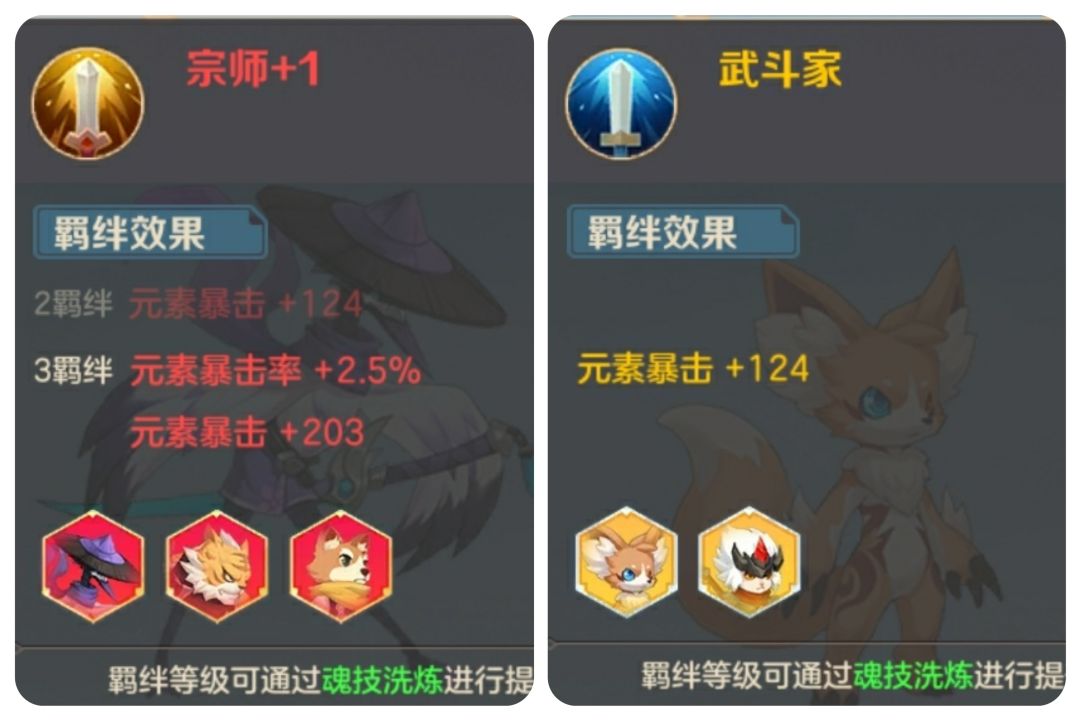第一个羁绊套装是主堆元素暴击,选择这个套装就是元素攻击走元素暴击路线,那么元素魂技就得优先凑出红色宗师三件套,其次是橙色武斗家两件套。