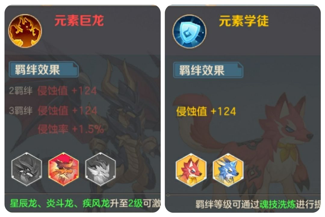 第二个羁绊套装是主堆元素侵蚀,选择这个套装就是元素攻击走元素侵蚀路线,那么元素魂技就得优先凑出红色元素巨龙三件套,其次是橙色元素学徒两件套。