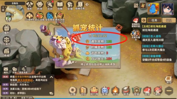 第三次,就是刚才我停止了,挂机45小时11分,抓了185只宠;