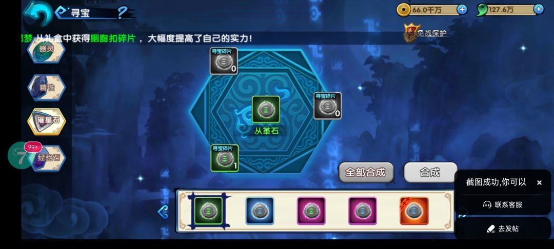 璀星石日常扫荡冒险副本也是可以获得的,如缺少碎片需要通过夺宝获得,合成碎片一般用于提升装备属性