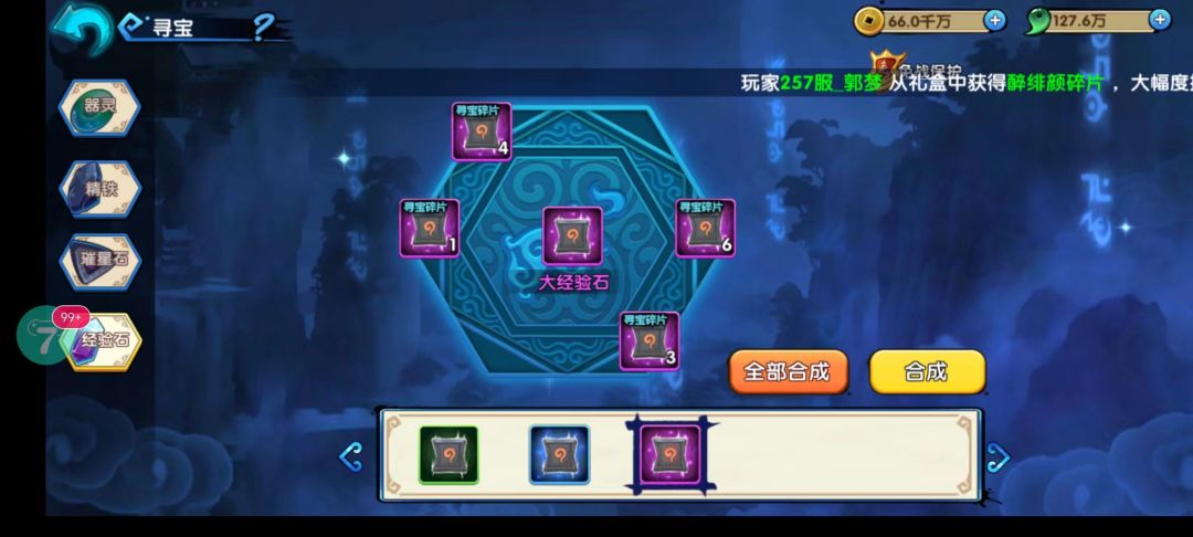 经验石日常扫荡冒险副本也是可以获得的,如缺少碎片需要通过夺宝获得,合成碎片一般用于提升璀星石