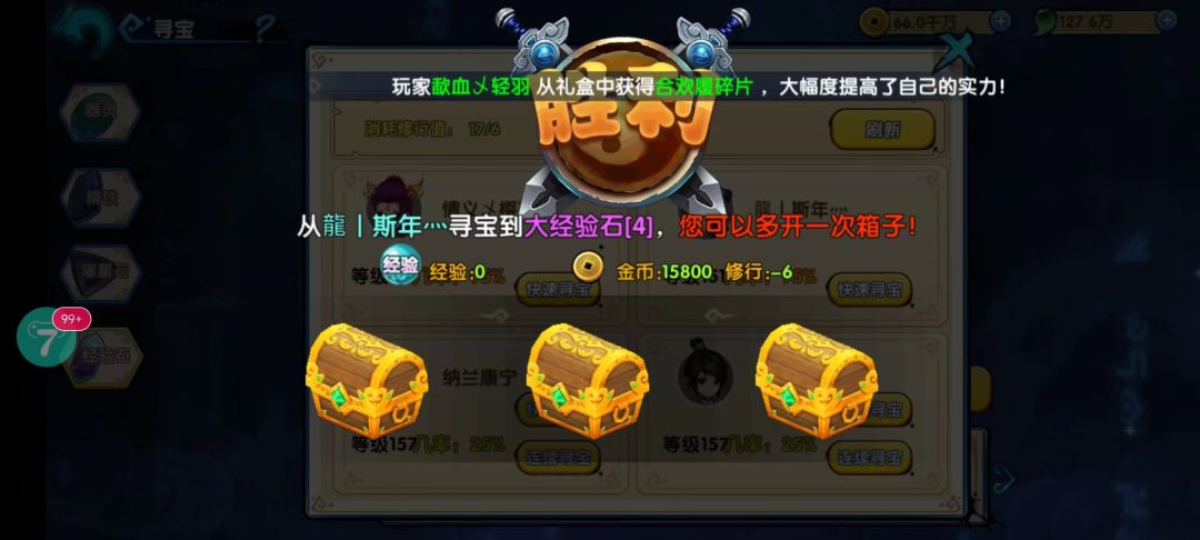 寻宝会根据玩家本身与寻宝目标的战斗力判断寻宝胜负,所以选择合适的目标和提升自身实力同样重要哟!这一区是根据战斗力来定输赢的,所以有必要的话可以把战力调整为虚战