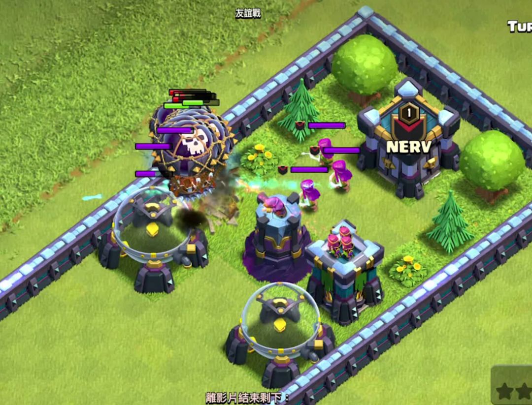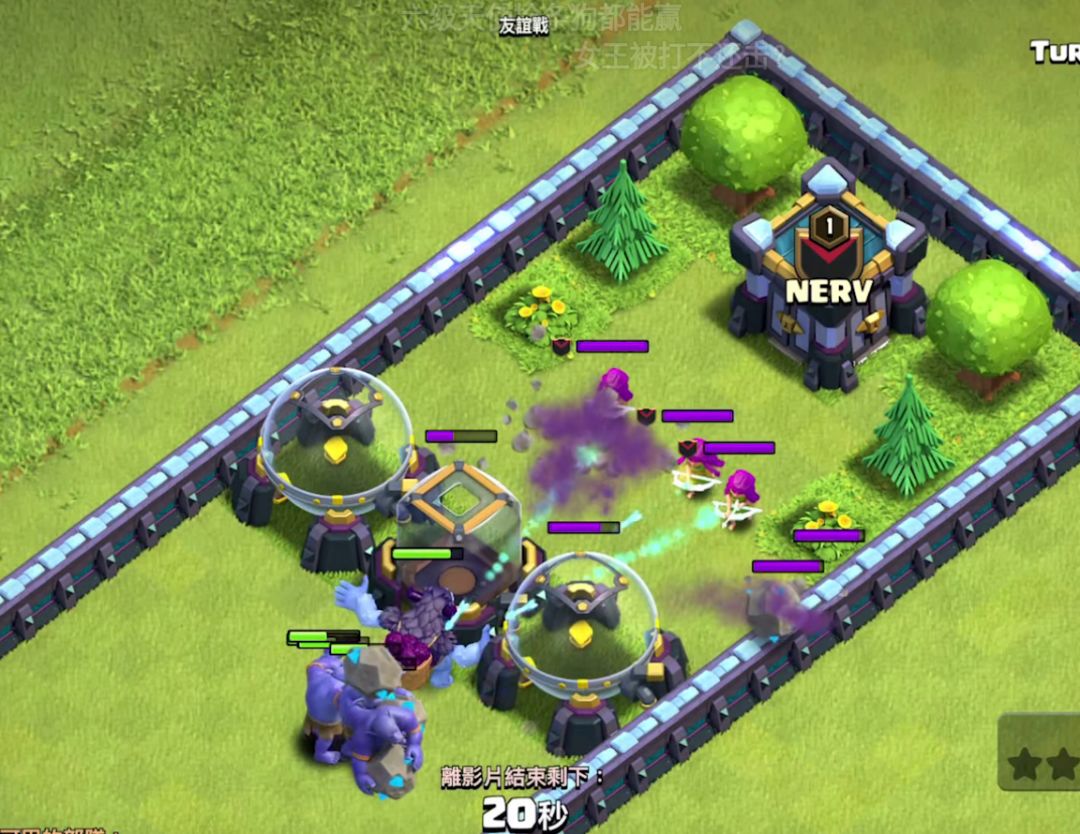 这是一场对雪蓝的防守,我的援军是一只冰人六只普通弓箭手,两只英雄猎手和一只超级弓箭手,超级弓箭手一只就够,作用就是勾引进攻部队,恶心对面。凭借一只超级弓箭手的勾引,成功将雪怪拉入城堡区块集火区。这里普及一个基础判定,当没有攻击偏向性的兵种进攻时,受到对方王和援军单位进攻时,会无视防御,优先攻击对方的援军和王,直到敌方部队被消灭。超级弓箭手其实没啥伤害,但是关键手长加有穿透伤害啊,勾引敌方部队进核心这个就很顶