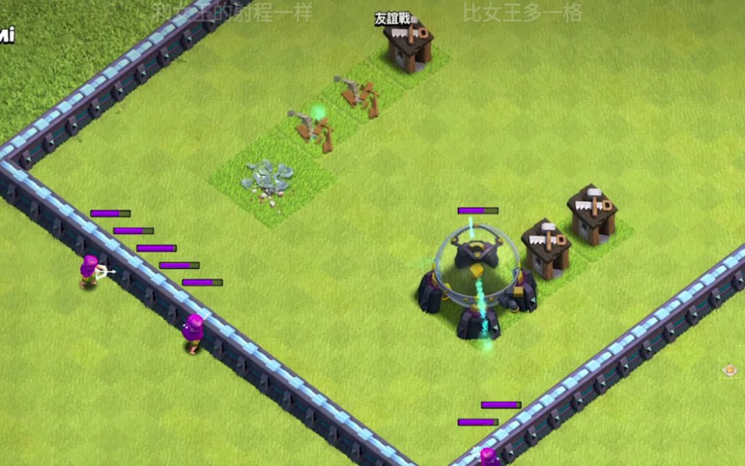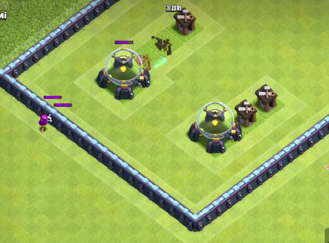 通过这两个图比对墙后五格明显不会打到建筑,所以,也就是说初始射程为六,可以代替女王打到墙内四格的距离。后续溅射伤害大体为10.5,因为投石会打不到超级弓箭手。