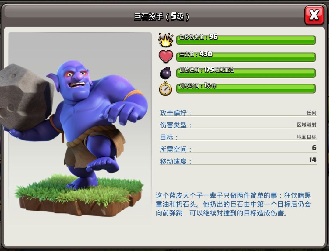 总射程大约是十格半。最远初始射程六格,溅射射程四格半。不管接触的第一个建筑距离多远,射程始终为十。这个射程,可以在不被攻击的情况下,溅射攻击可攻击到投石炮单头箭塔这种射程十格以及以下的建筑。这应该是有效射程最高的兵种了吧。