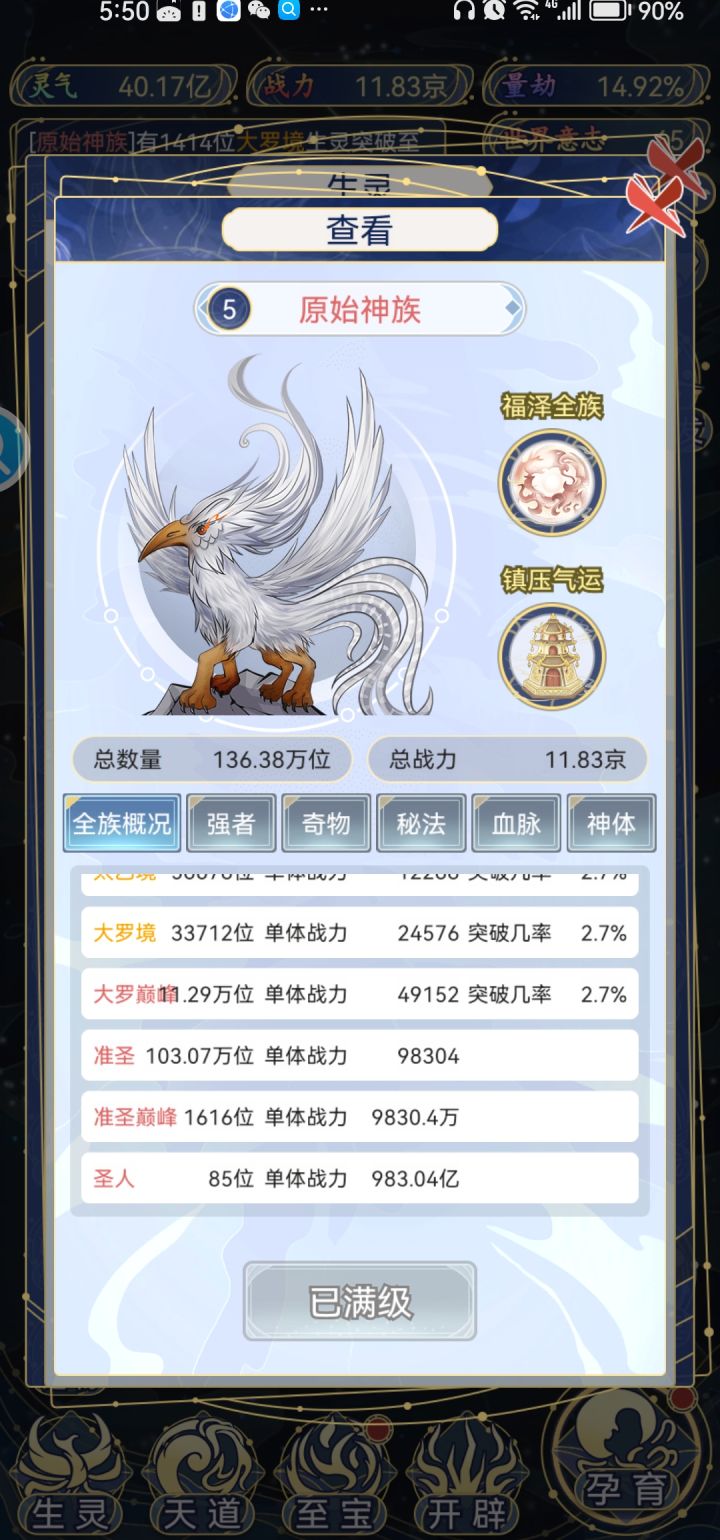 本人第一次玩此类游戏,初次接触还是感觉比较新颖的,玩了两三个小时才大概找到方向:切记不要追求种族个数,因为游戏设定必须要三个种族才能上阵,所以,通过“孕育生灵”随便孕育出三个种族就可以停止了,因为所拥有的种族越多,将会导致资源越分散,因为资源是随机分配给所有已经拥有的种族的,而且初期多余的种族不能分解。实际上主力培养的资源要尽最大努力选择性只倾向一个种族,另外两个种族就是打酱油的。而且初期培育也不要追求高等种族(由低到高:黑、绿、紫、黄、红),因为高等种族要在世界进化更高级才会有几率孕育出来(红色的应该是要进化到大千世界才有几率孕育出来),并且低等种族其实没有太大的区别,所以初期主要方向是随便孕育出三个种族之后,选定其中一个作为主力孕育,主要点击“血脉诞生”,其次是“福泽某个种族”,出现自己的主力种族就可以点。然后就是不停迁越星球,积累世界意志,世界意志第一优先升级世界。我自己是主培人族,一直将世界升到最高级无垠世界,然后才再次孕育生灵弄到一个红色种族,然后在主宰天罚里分解多余的种族只保留3个种族,注意现在保留的三个种族(含红色)都是刚孕育的,原始人数基本为0,所以在进行分解最开始培养的三个种族(含人族)的时候,务必选择花费5个世界意志,进行分解,这样人族被分解后的人数会随机投胎到新种族,如果投胎到了酱油种族,就再孕育一个新种族,把酱油种族分解,直到被分解的人数投胎到红色种族,这样红色种族就不会从0玩起。所以还要特别注意,准备更换高等种族(红色)做主力之前,务必要存一些世界意志,因为分解多余种族需要用到的。换好高等种族之后,接下来就是先把红色种族的血脉、法宝等等培养满,最后就是主宰-外域加速获得鸿蒙紫气,在成圣里面进行准圣巅峰进阶圣人,获得圣人战力翻千倍,是后期获得战力提升的唯一方法,这个时候基本就毕业了。(补充说明,准圣巅峰的数量越多,进阶为圣人的概率越高,而准圣巅峰则只能靠星球上长出来的其中一种奇遇事件获得)