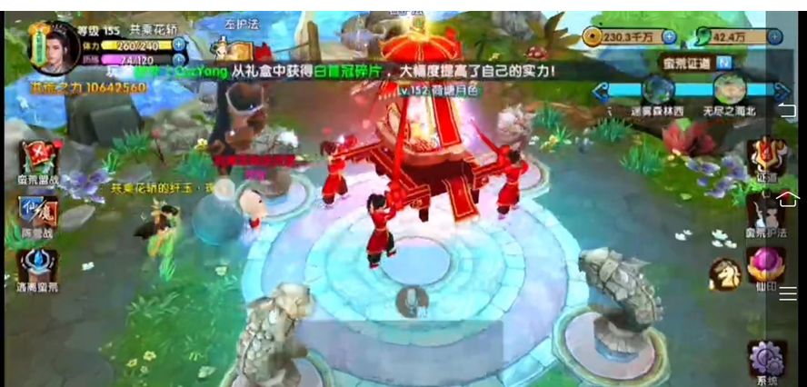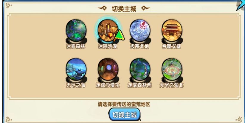 点击主城切换,花轿第二站来到蛮荒。蛮荒有八大主城。选择迷雾森林,点击切换主城,花轿就被传送到迷雾森林,体验花千骨最初上长留的考试之地。我们也可选择迷踪沙漠、极寒北地、吞噬戈壁、无尽之海、迷踪沙漠东、迷雾森林西、无尽之海北。各主城风景各异,美不胜收。