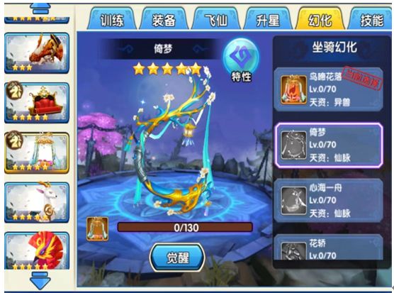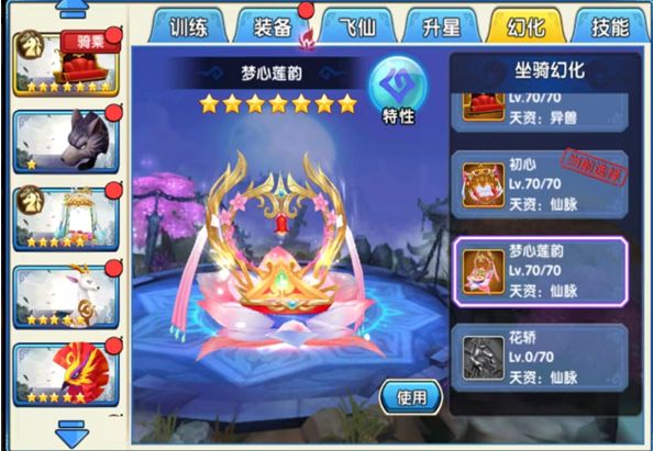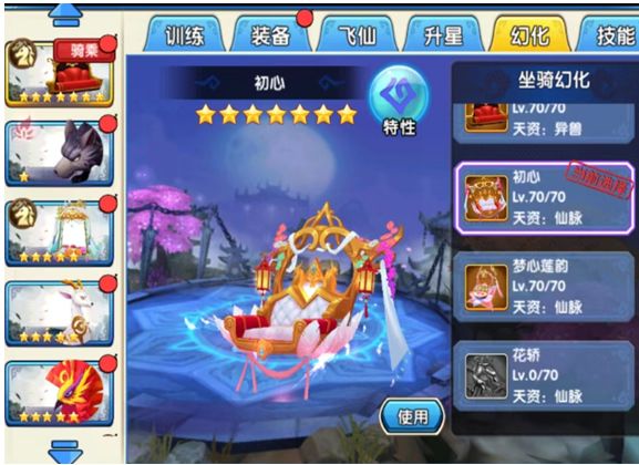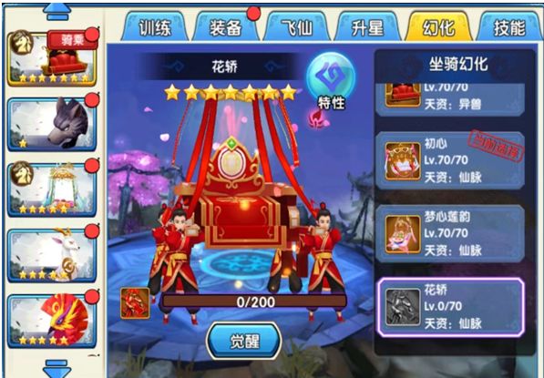 灯影阑珊是罕见的双人坐骑,可以邀请好友一同乘坐。220个灯影阑珊碎片,召唤5星灯影阑珊,可以在长留、瑶歌城行走。63个灯影阑珊碎片升星为6星坐骑,75个灯影阑珊碎片升星为7星坐骑。7星坐骑可以进入七杀殿与蛮荒战斗游玩。130个灯影阑珊碎片幻化为初心,150个鸟啼花落碎片幻化为梦心莲韵,200个花轿碎片幻化为花轿。