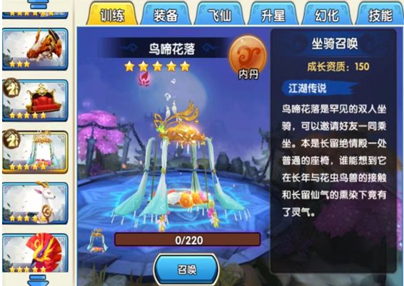 鸟啼花落是罕见的双人坐骑,可以邀请好友一同乘坐。220个鸟啼花落碎片,召唤5星鸟啼花落,可以在长留、瑶歌城行走。63个鸟啼花落碎片升星为6星坐骑,75个鸟啼花落碎片升星为7星坐骑。7星坐骑可以进入七杀殿与蛮荒战斗游玩。130个鸟啼花落碎片幻化为倚梦,150个鸟啼花落碎片幻化为心海一舟,200个花轿碎片幻化为花轿。