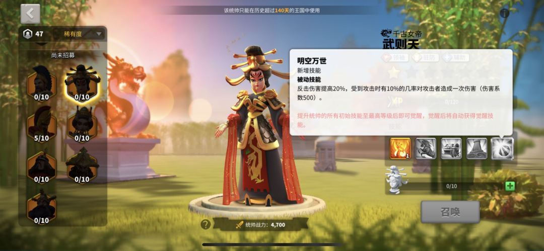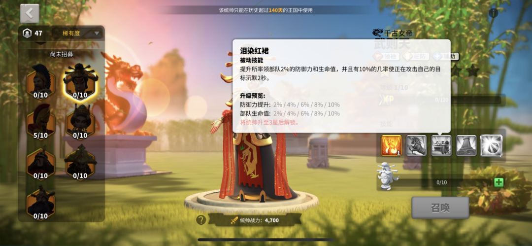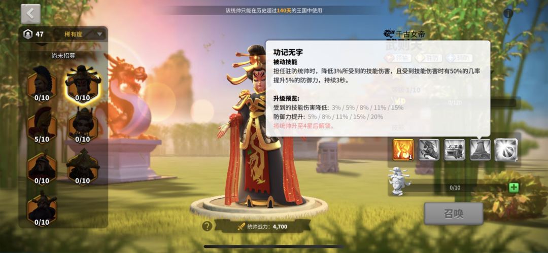 天赋方面,武则天是领袖+驻防+辅助天赋。大家都知道,辅助天赋对于技能加成非常大,因此武则天通常选择辅助+驻防的点法,这一套配合李成桂或者阿尔特米亚一世有着及其高的技能频率。